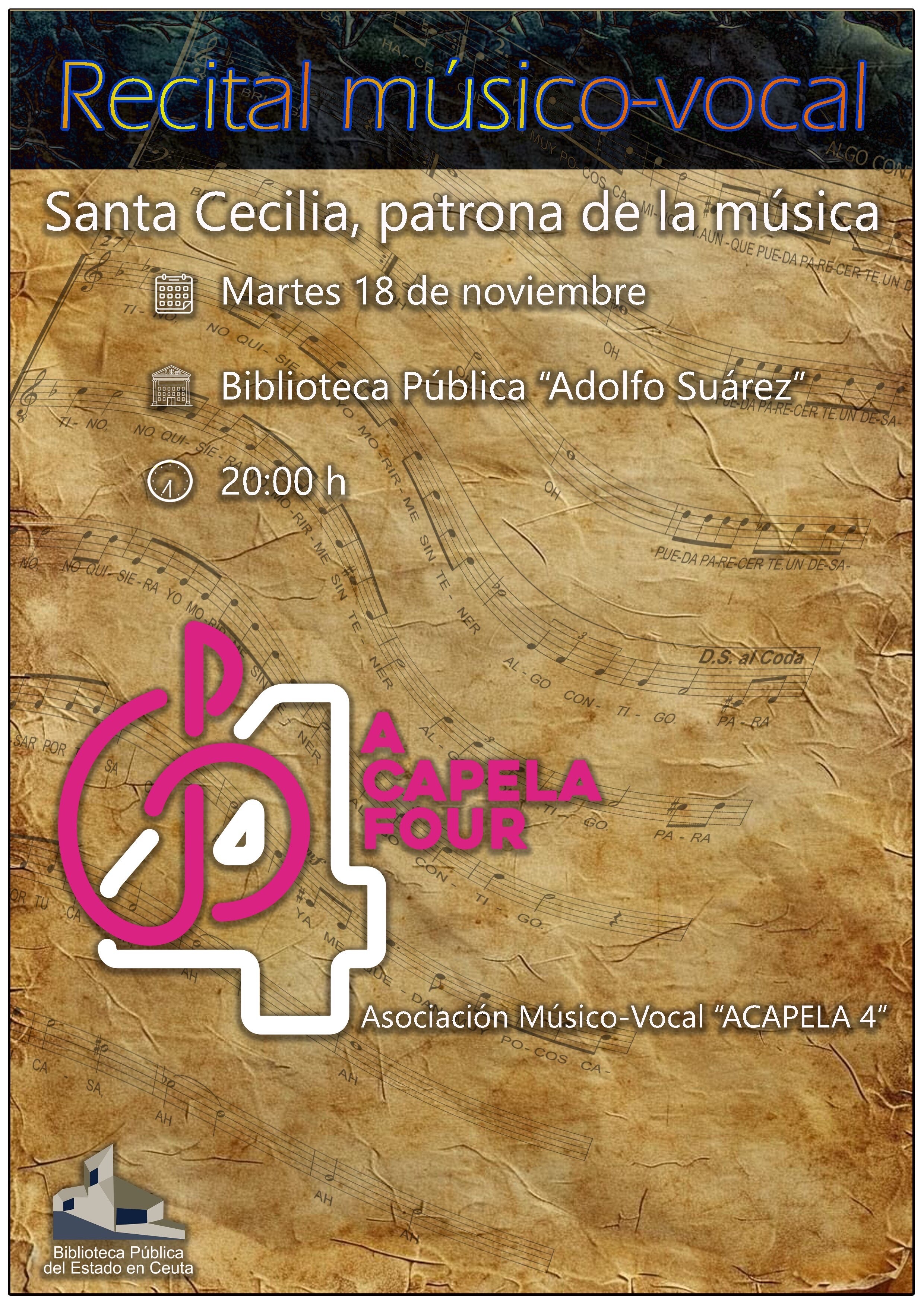 Este martes, a las 20:00 horas, en la Biblioteca Pública del Estado Adolfo Suárez, tendrá lugar el concierto con motivo de la festividad de Santa Cecilia, Patrona de la música, del cuarteto vocal 'ACAPELA4', un recital en el que se interpretarán obras contemporáneas, de autores como Serrat, Pablo Milanés, Kike Santander, Chico Novarro, E. Tozzi, entre otros.