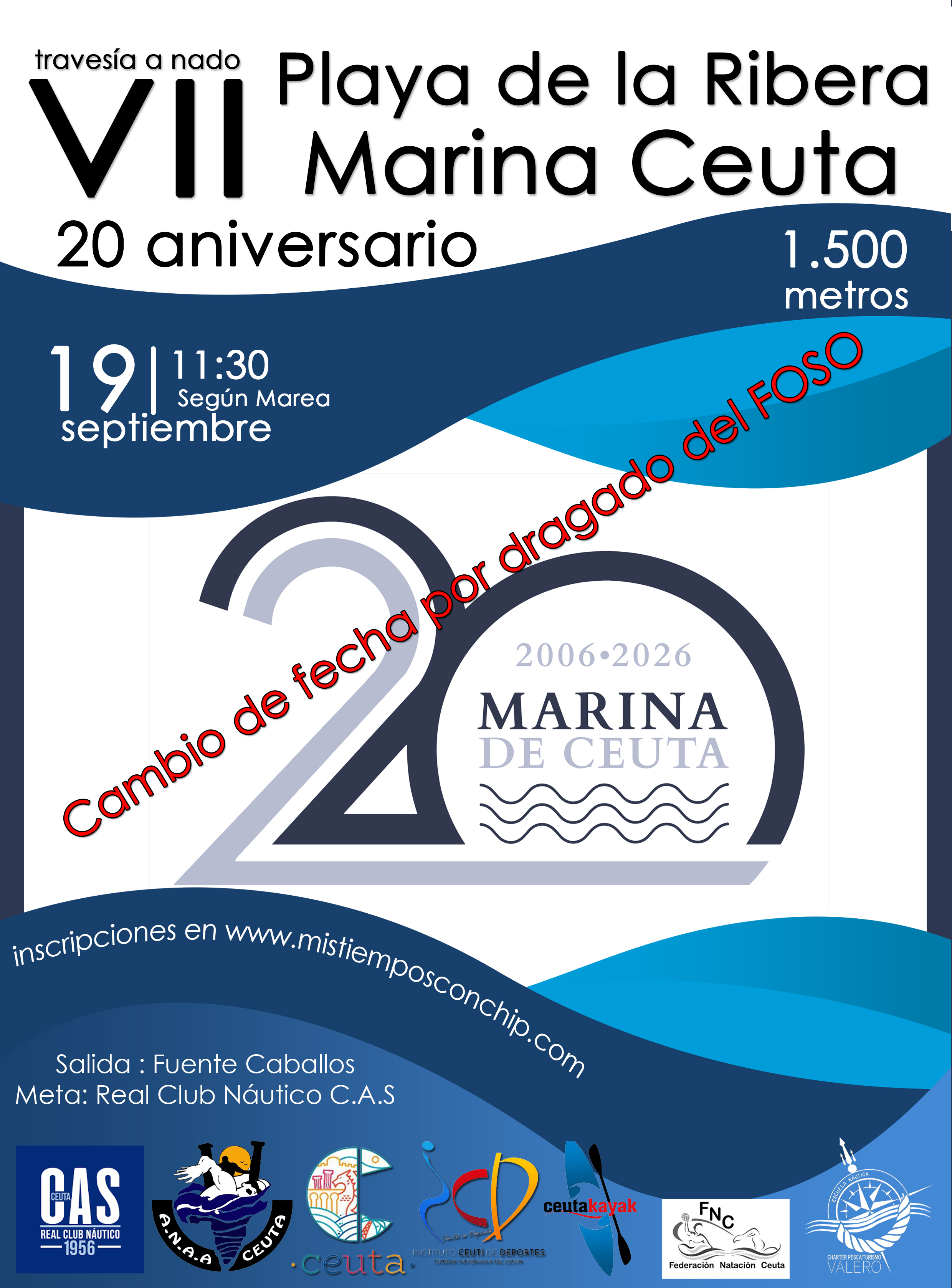 La Asociación de Natación en Aguas Abiertas de Ceuta ha informado este sábado del aplazamiento de la Travesía Ribera-Marina Ceuta, inicialmente prevista para el próximo 9 de mayo, debido a los trabajos de dragado del Foso que han comenzado este viernes. La prueba se celebrará finalmente el 19 de septiembre, tras la imposibilidad de garantizar el desarrollo normal del evento en la fecha original.