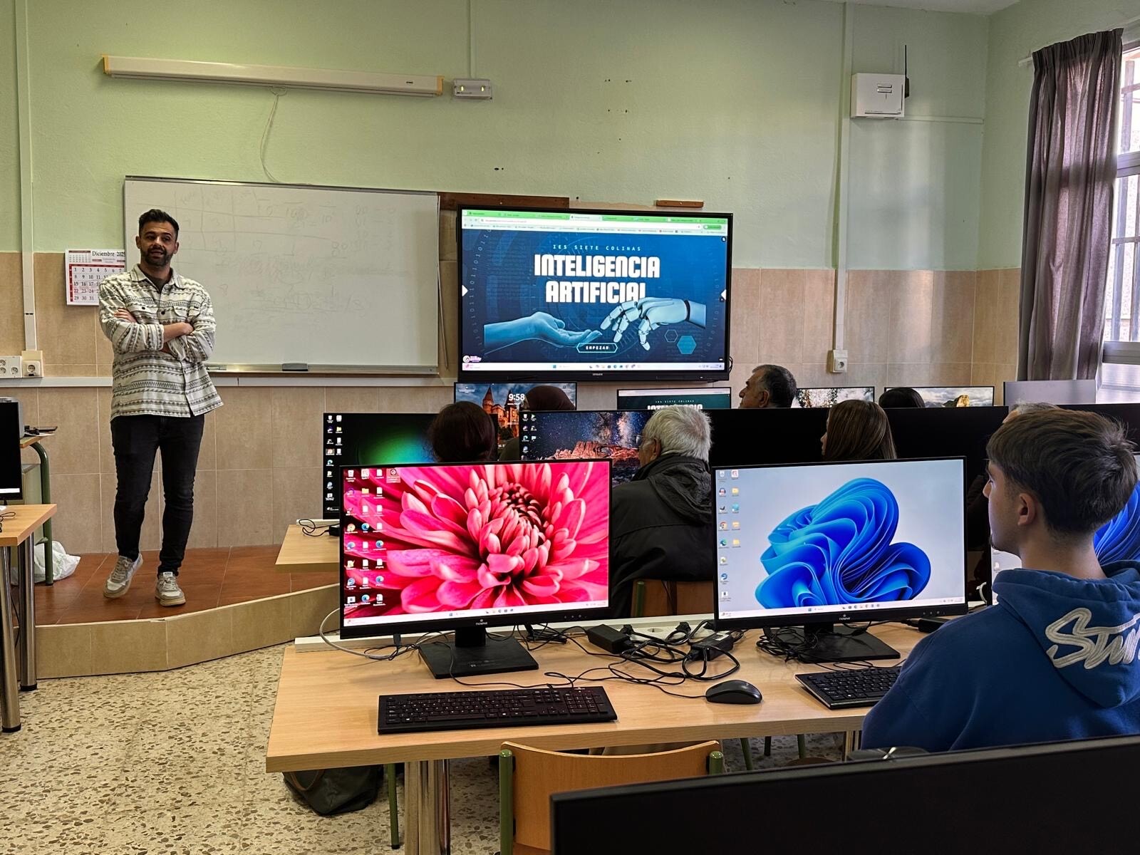 El IES Siete Colinas ha celebrado recientemente un Taller de Inteligencia Artificial (IA) promovido por el Departamento de Informática del centro en colaboración con el Aula de Mayores de la Universidad de Granada (UGR). Esta actividad ha tenido como objetivo ·acercar las nuevas tecnologías a los participantes del Aula de Mayores de la institución nazarí fomentando el intercambio intergeneracional y la divulgación de competencias digitales.