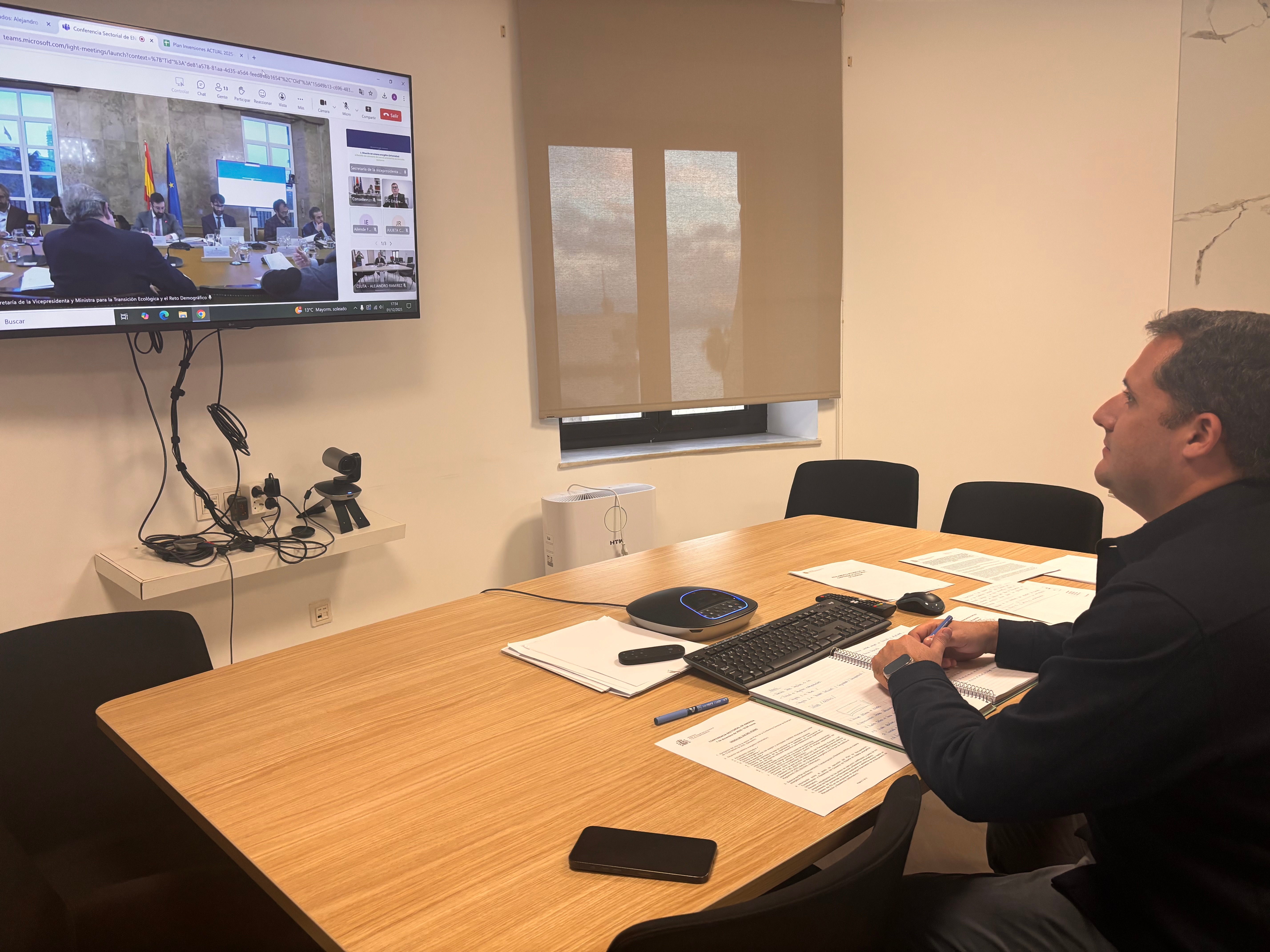 El vicepresidente primero y consejero de Medio Ambiente, Servicios Urbanos y Vivienda, Alejandro Ramírez, ha participado este lunes por videoconferencia en la Conferencia Sectorial convocada por el Ministerio para la Transición Ecológica y el Reto Demográfico, un encuentro en el que se ha realizado balance de las actuaciones vinculadas al Plan de Recuperación en materia energética y en el que Ceuta ha expuesto su grado de ejecución.