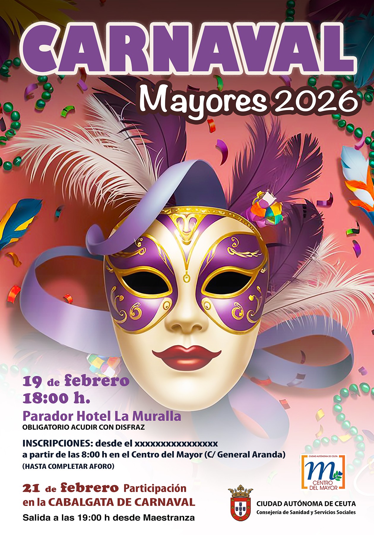 El Centro del Mayor, dependiente de la Consejería de Servicios Sociales, ha organizado una fiesta de Carnaval de mayores dentro de su programa de Envejecimiento Saludable. La actividad consiste en el Concurso -Merienda que tendrá lugar el día 19 de febrero a partir de las 18.00 horas en el Hotel-Parador La Muralla, donde se premiarán los mejores disfraces en las distintas modalidades. La merienda estará amenizada por una orquesta para el baile de disfraces.