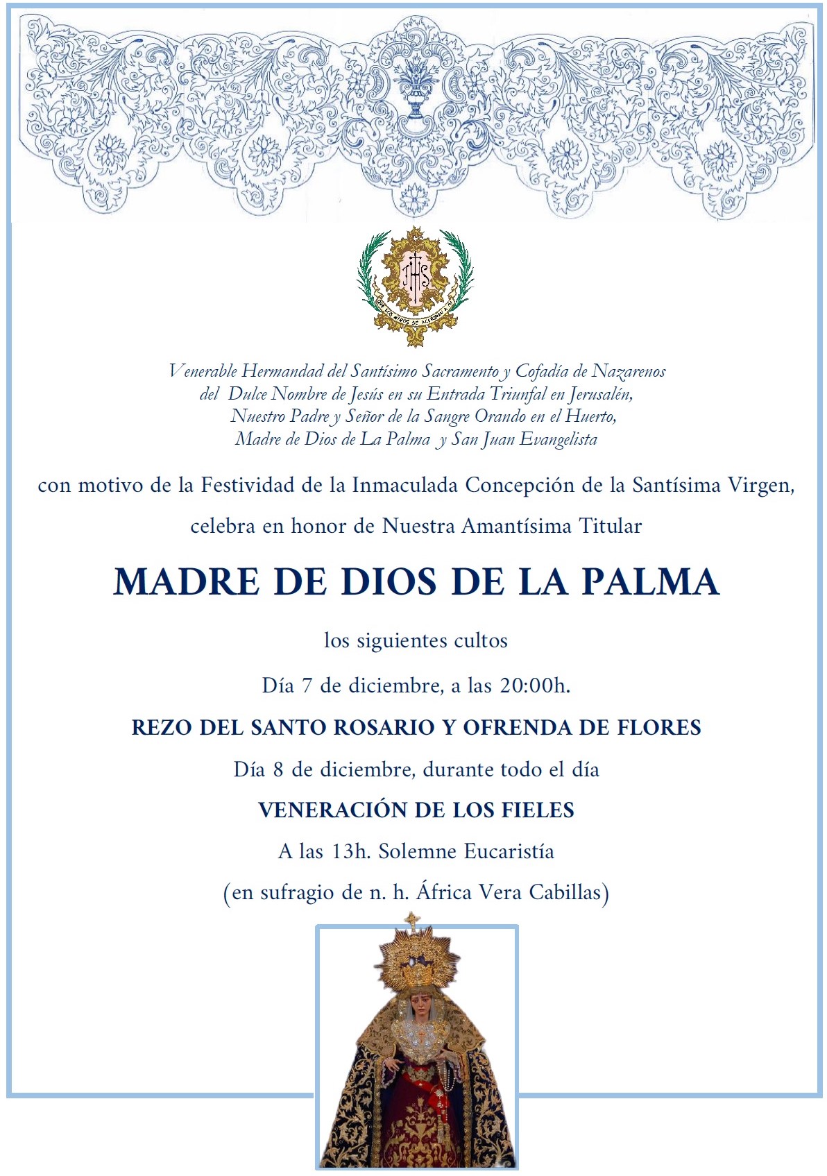 Con motivo de la festividad de la Inmaculada Concepción de la Santísima y Virgen, la Venerable Hermandad del Santísimo Sacramento y Cofradía de Nazarenos del Dulce Nombre de Jesús en su Entrada Triunfal en Jerusalén, Nuestro Padre y Señor de la Sangre Orando en el Huerto, Madre de Dios de La Palma y San Juan Evangelista ha informado de que "al dictado de lo dispuesto en nuestras Reglas, la hermandad celebrará cultos en honor de nuestra Titular, Madre de Dios de La Palma".