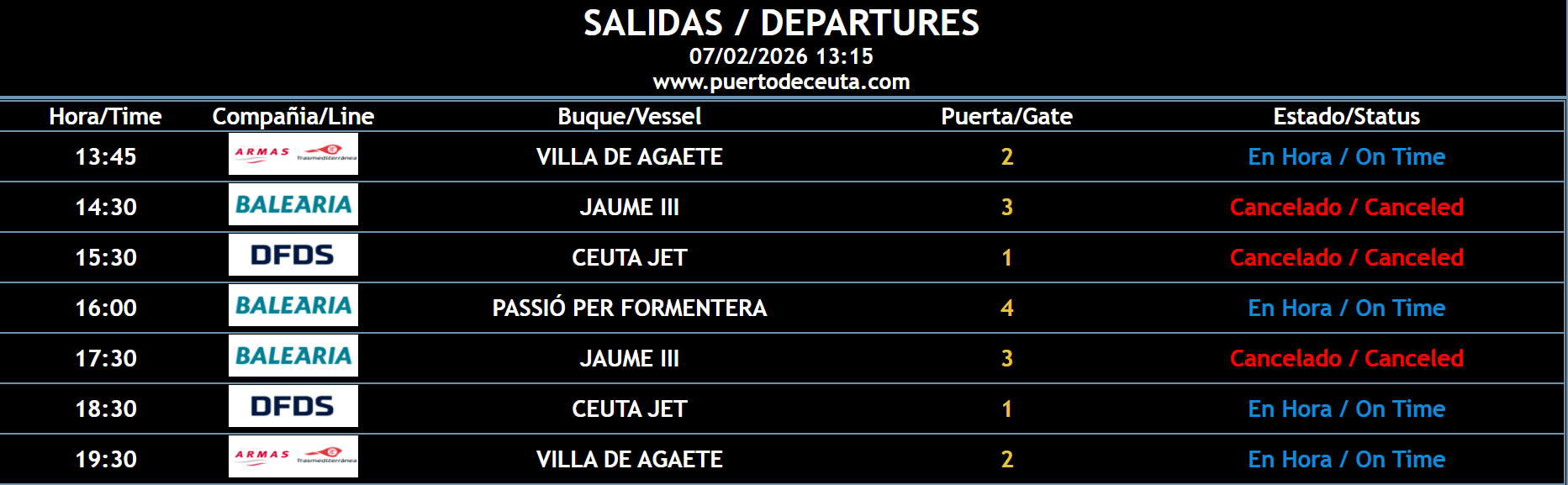 Por el momento, el Ceuta Yet de FDFS tiene prevista su salida a las 18:30. El Passio per Formentera de la compañía Baleria mantiene de momento también sus salidas. Se recomienda revisar las actualizaciones de la Autoridad Portuaria a través de sus redes sociales y la página web del Puerto de Ceuta para conocer los posibles cambios y cancelaciones en este sábado marcado por las inclemencias meteorológicas