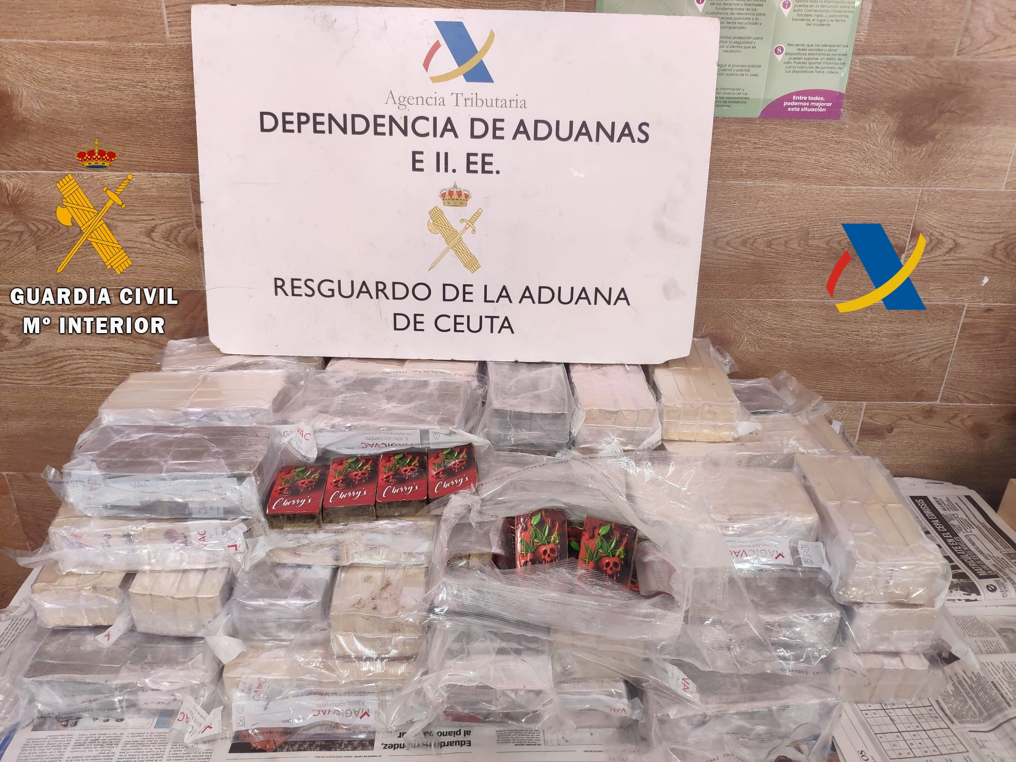 Componentes de la 1ª Compañía Fiscal y de Fronteras y del Grupo Cinológico de la Comandancia de la Guardia Civil de Ceuta que prestan servicio de reconocimiento de los vehículos que pretenden embarcar con destino a Algeciras han interceptado este viernes sobre las 14.00 horas un total de 74 kilos de hachís a bordo de un vehículo de matrícula nacional.